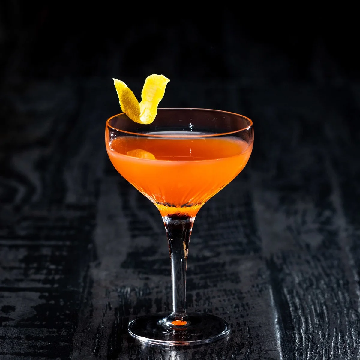 An orange-colored cocktail in a coupe glass garnished with a lemon twist on the rim, set against a black background.