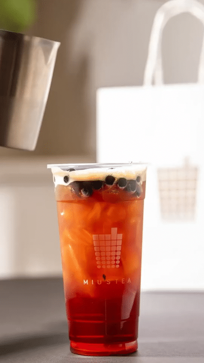 A hot beverage cup with steam rising, decorated with Greek motif and the phrase 'It's our pleasure to serve you', placed on a blue pedestal against a blue sky background.
