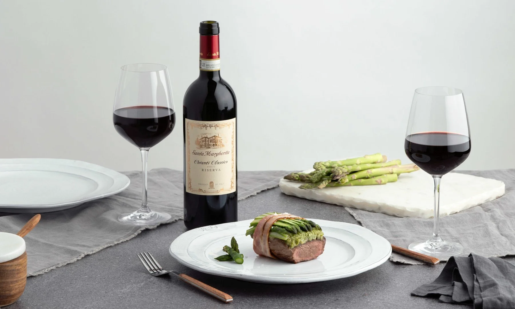 A dining table with a bottle of red wine, two glasses of red wine, a plate with a cooked beef tenderloin wrapped in asparagus, a bunch of raw asparagus, and a stack of white plates.