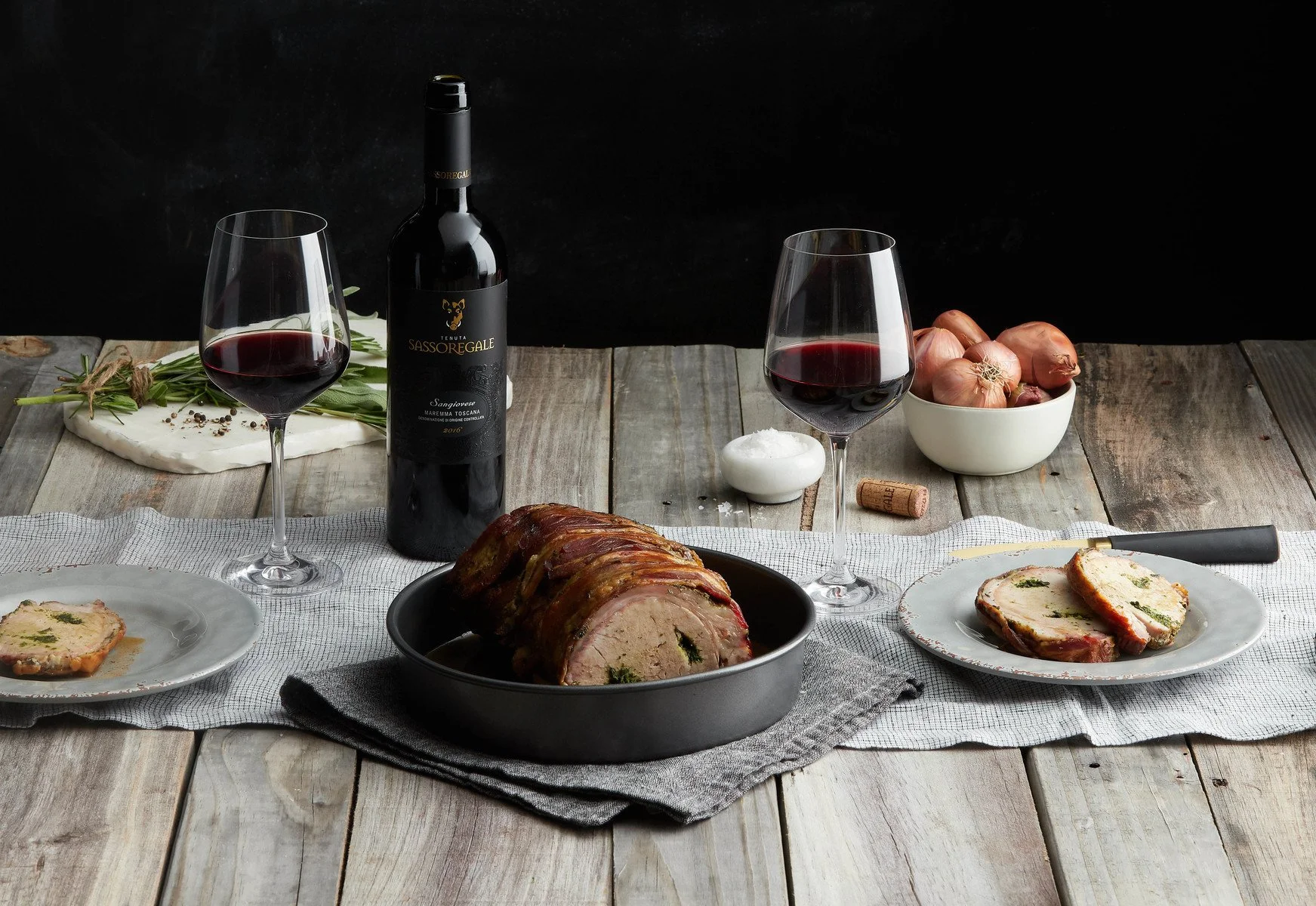 A rustic wooden table set for a meal with two glasses of red wine, a bottle of red wine, a roasted stuffed meat in a black baking dish, two sliced pieces of stuffed meat on white plates, a bowl of onions, a small bowl of salt, a cork, and a bunch of