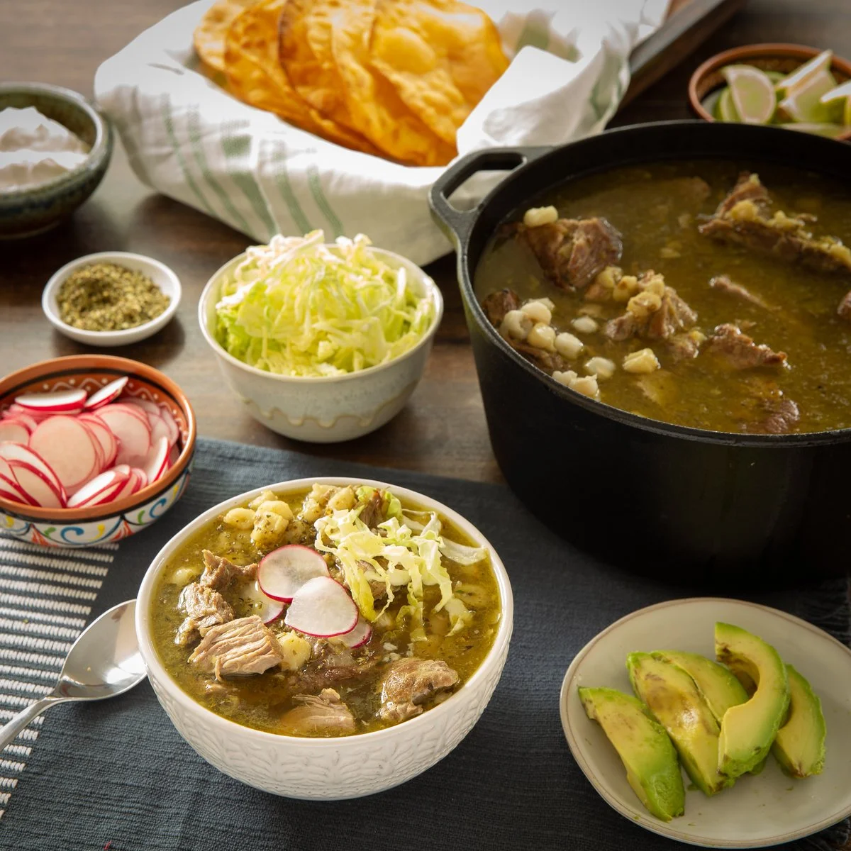 Traditional Mexican dishes including soup with beef and vegetables, a bowl of shredded lettuce, sliced radishes, sliced avocado, tortilla chips, lime wedges, and various condiments and seasonings.