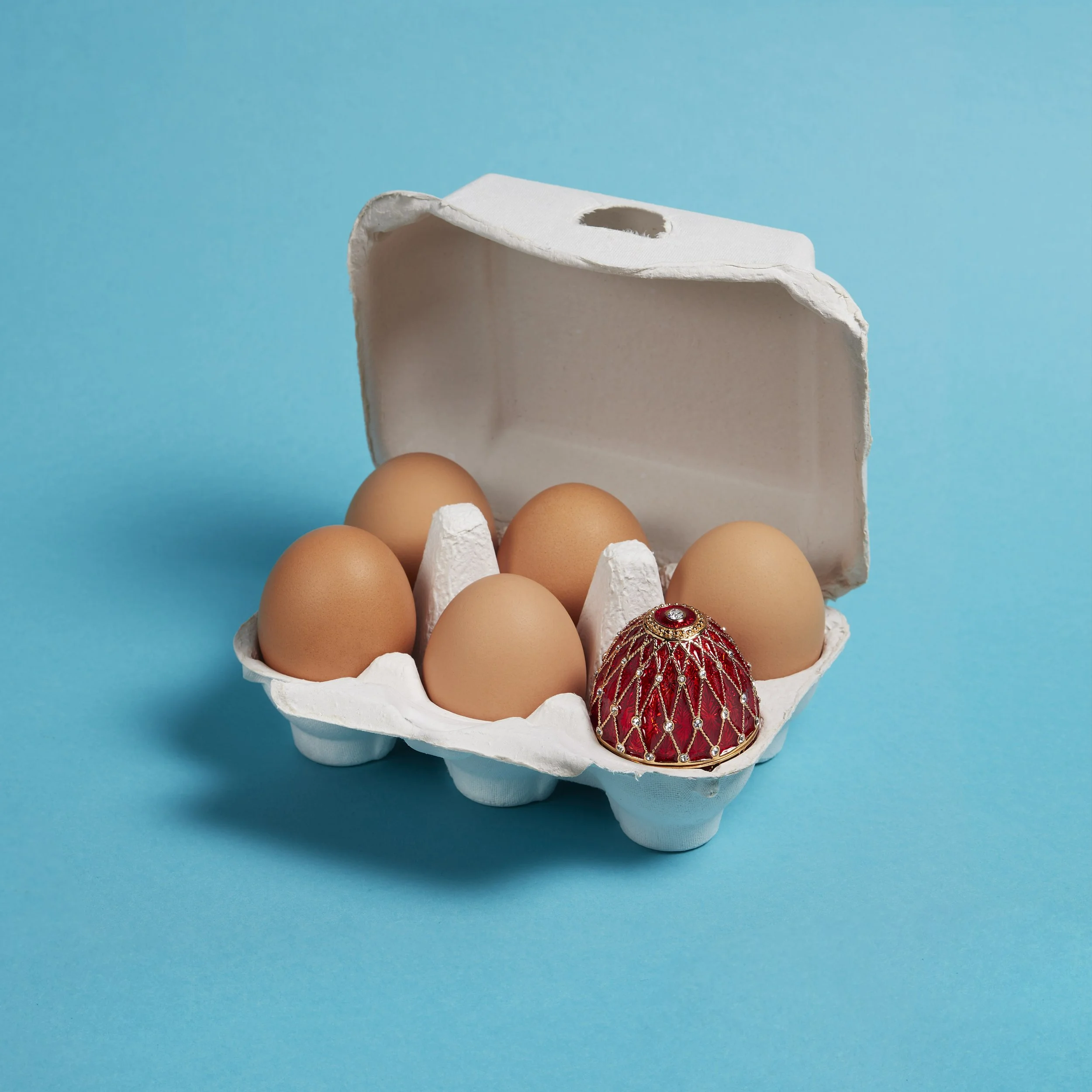 Egg carton with six brown eggs and a decorative red and gold egg-shaped ornament on a blue background.