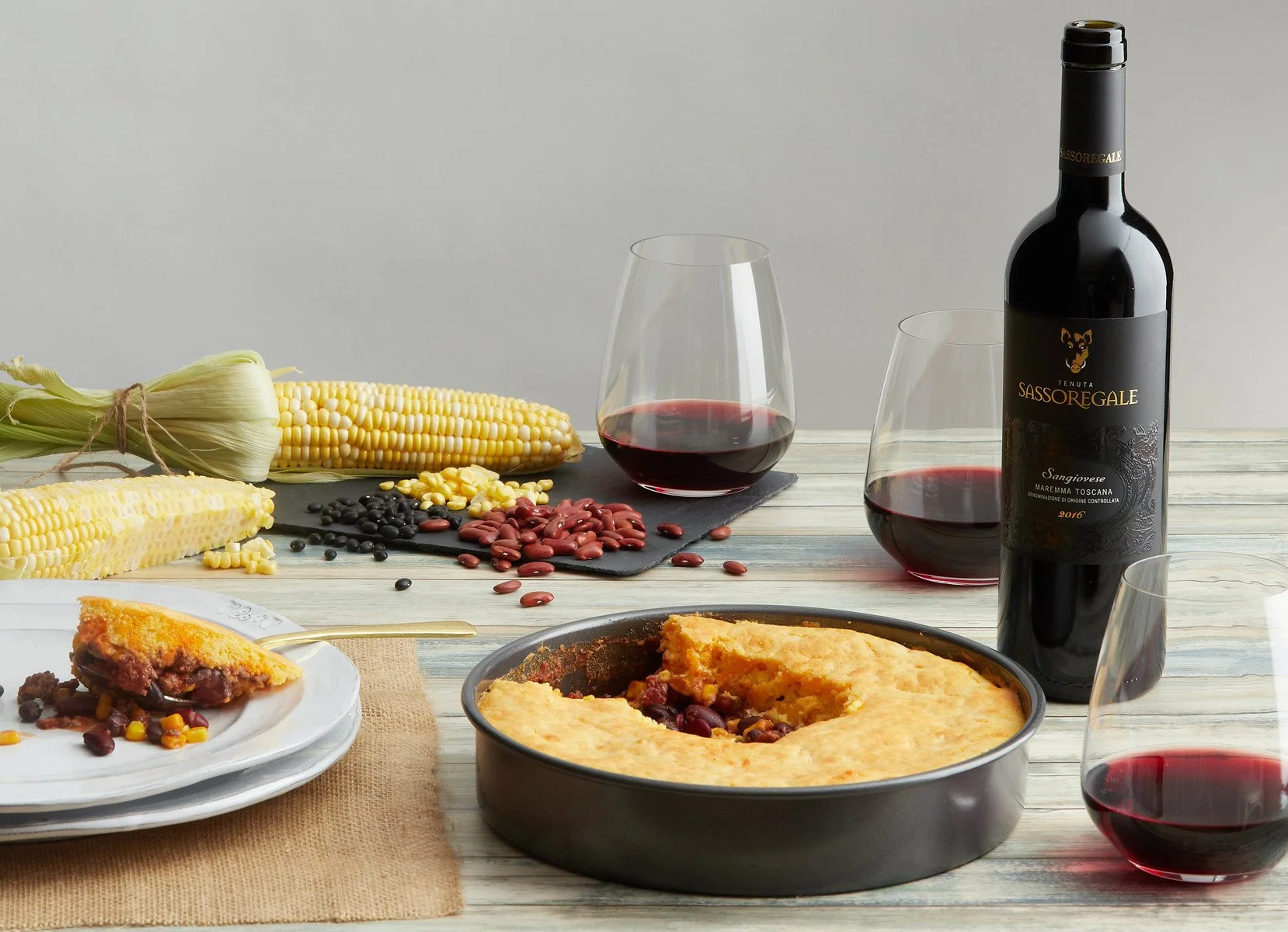 A table set with a partially sliced cornbread casserole, a plate with a slice of cornbread and chili beans, three glasses of red wine, a bottle of red wine, corn on the cob with husks, and various beans on a dark slate serving tray, all on a light wo