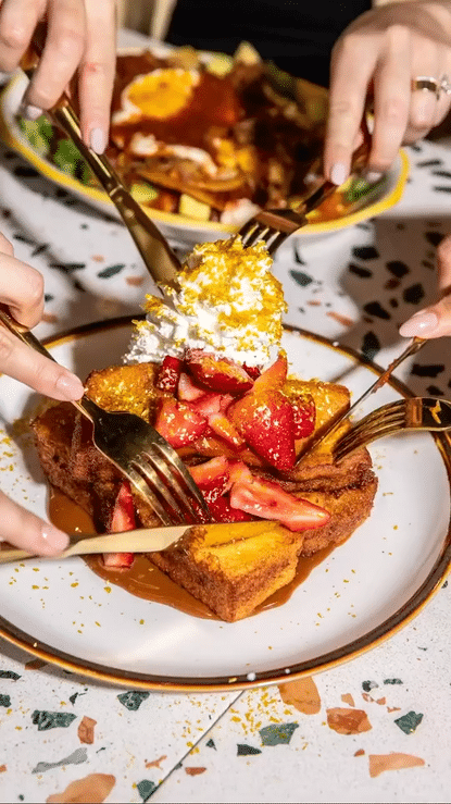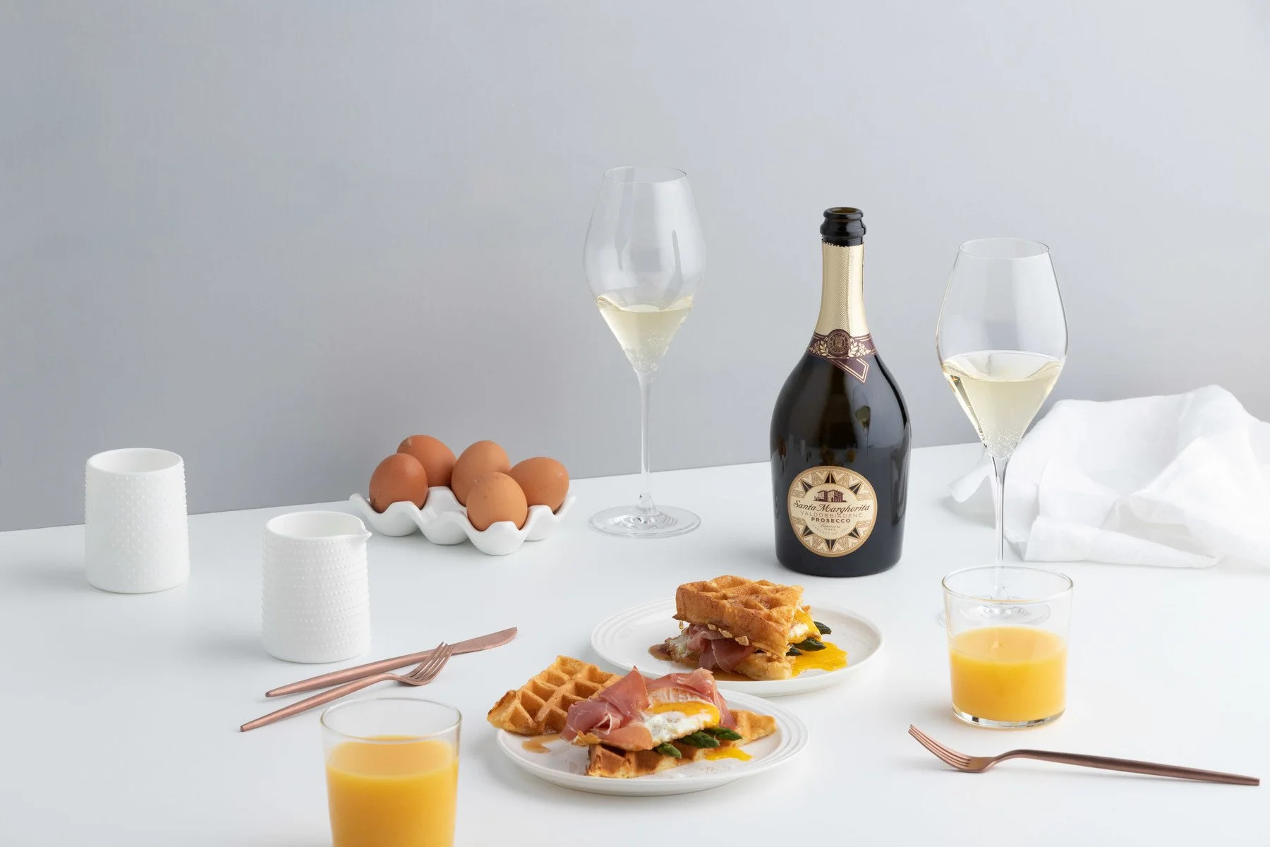 A breakfast scene on a white table with two plates of waffles with prosciutto and eggs, two glasses of white wine, a bottle of prosecco, two glasses of orange juice, a basket of eggs, two white candles, and utensils, set against a light gray backgrou