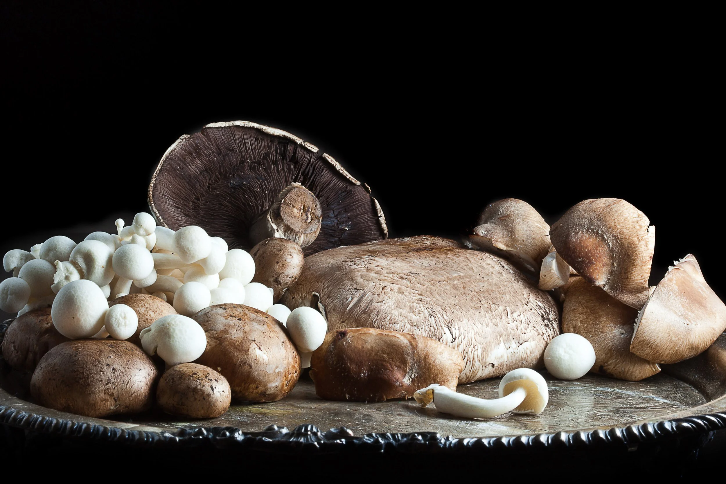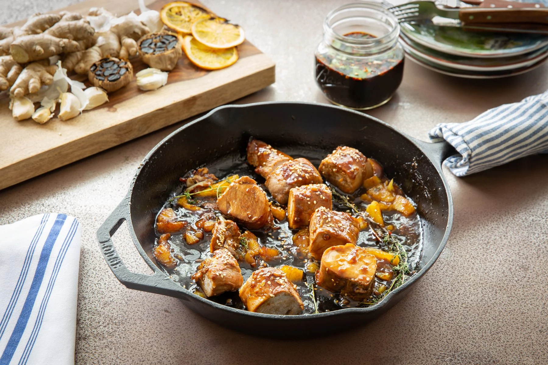 Cooked chicken and vegetables in a black skillet on a beige countertop, with sliced oranges, ginger, garlic, and two shiitake mushrooms on a wooden cutting board, a small jar of sauce, stacked bowls, and a striped kitchen towel nearby.