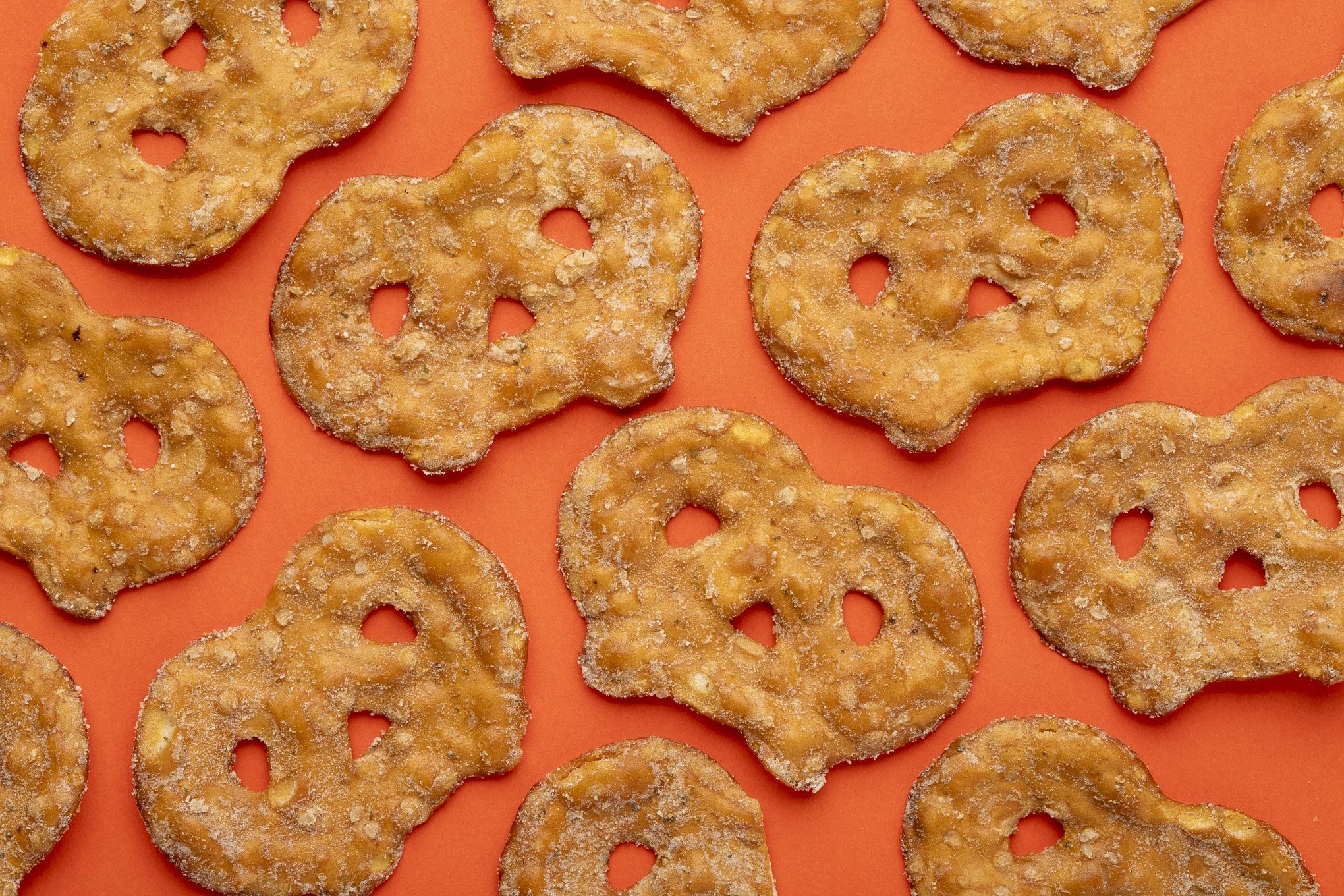 Close-up view of salted and seasoned pretzel snacks with holes in the shape of pretzels, on a bright green background.