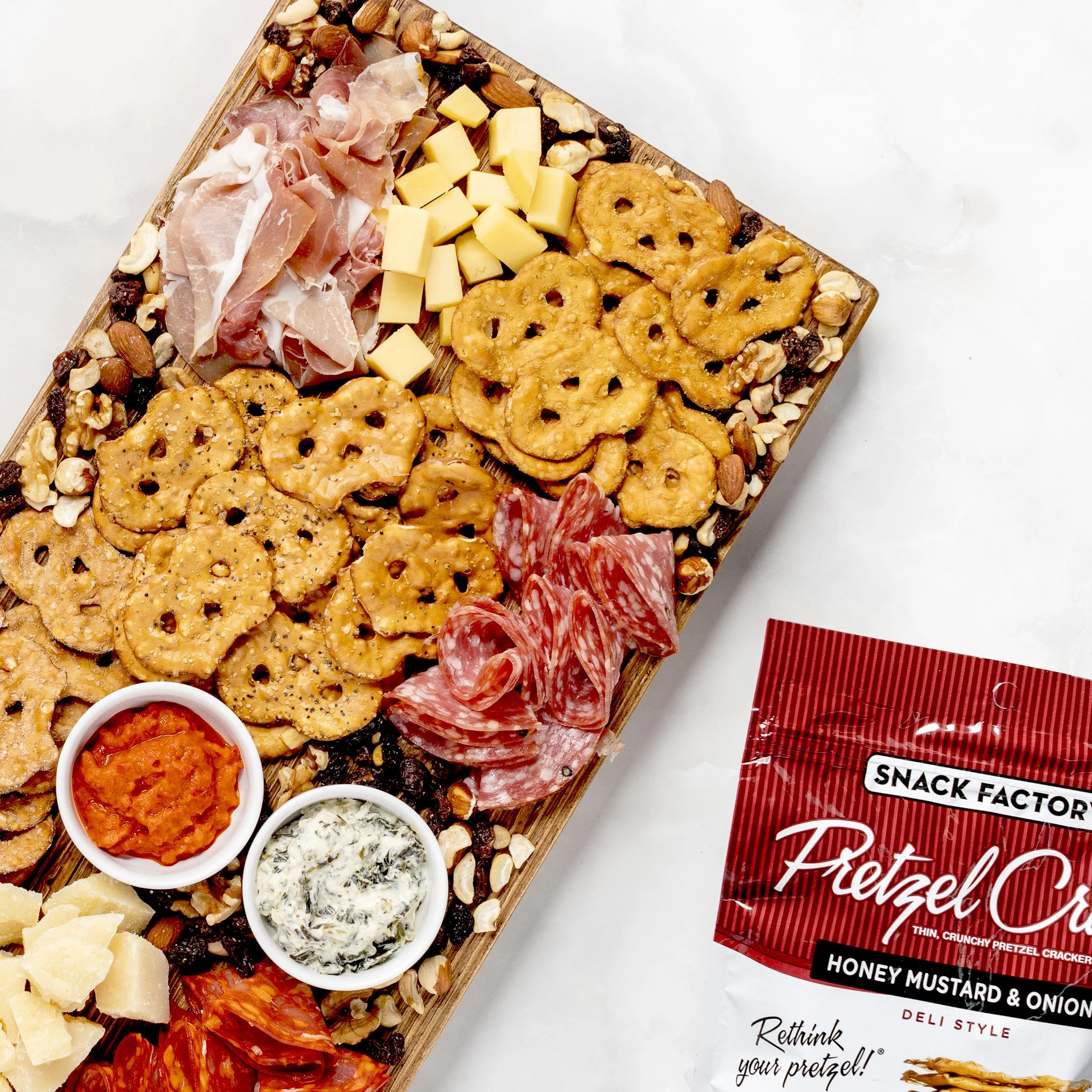 A wooden serving board with pretzels, sliced cured meats, cheese cubes, mixed nuts, and two small bowls of dips on a white surface. A red bag of Snack Factory Pretzel Crisps is partially visible nearby.