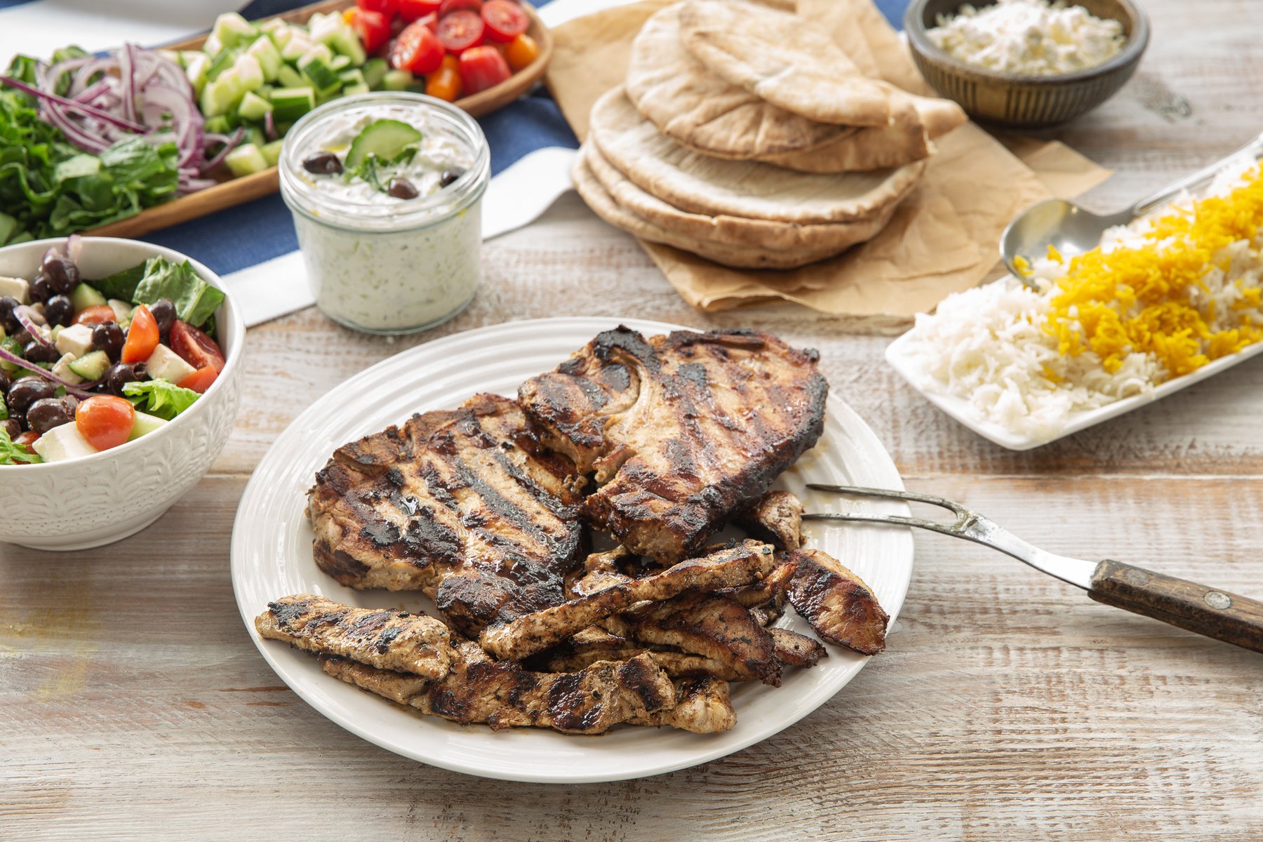 Grilled pork chop with sides of barbecue sauce, rice with saffron, pita bread, and a vegetable salad with tomatoes, cucumbers, onions, and olives on a rustic wooden table.