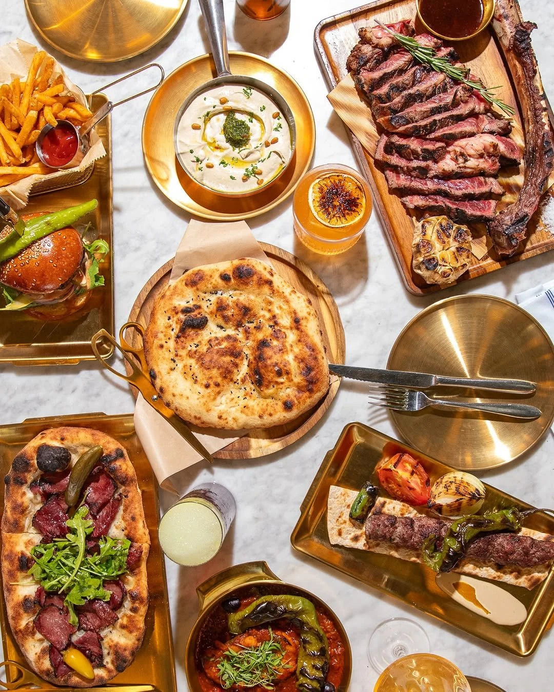 A table filled with various dishes including grilled steak, pizza, a burger with lettuce and tomato, fries with ketchup, a salad with dressing, and roasted vegetables, along with glasses of beverages.
